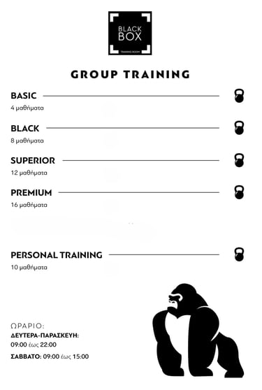 Στο Blackbox, το Group Training είναι ο ιδανικός τρόπος να γυμναστείτε δυναμικά και με κίνητρο, σε ένα υποστηρικτικό και φιλικό περιβάλλον. Με την καθοδήγηση εξειδικευμένων προπονητών και την ενέργεια της ομάδας, κάθε προπόνηση γίνεται μια συναρπαστική εμπειρία. Το πρόγραμμα προσαρμόζεται στις ανάγκες και το επίπεδο κάθε συμμετέχοντα, επιτρέποντας σε όλους να βελτιώσουν τη φυσική τους κατάσταση με ασφάλεια και αποτελεσματικότητα.